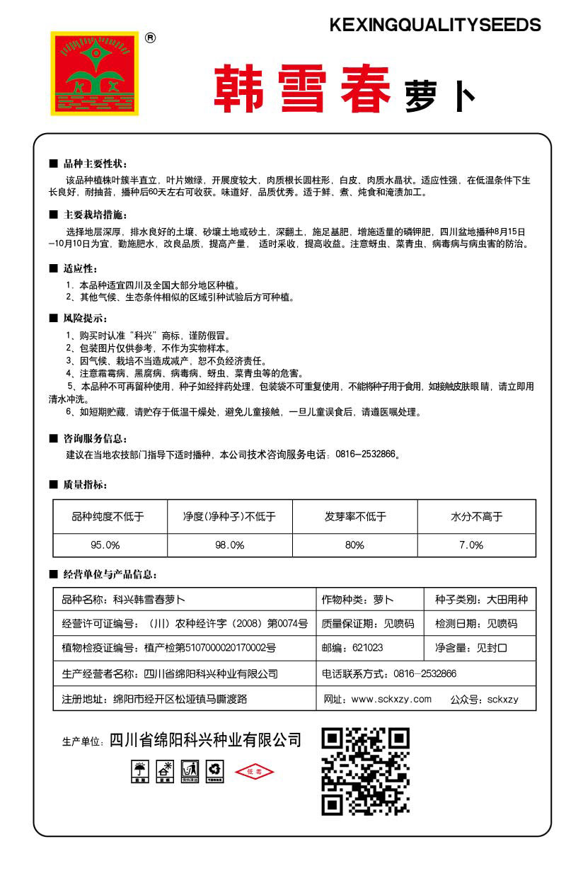 該品種植株葉簇半直立,葉片嫩綠,開展度較大。肉質(zhì)根長圓柱形,白皮,肉質(zhì)水晶狀。適應性強,在低溫條件下生良好,耐抽苔,播種后60天左右可收獲。味道好,品質(zhì)優(yōu)秀。適于鮮,煮,燉食和淹漬加工