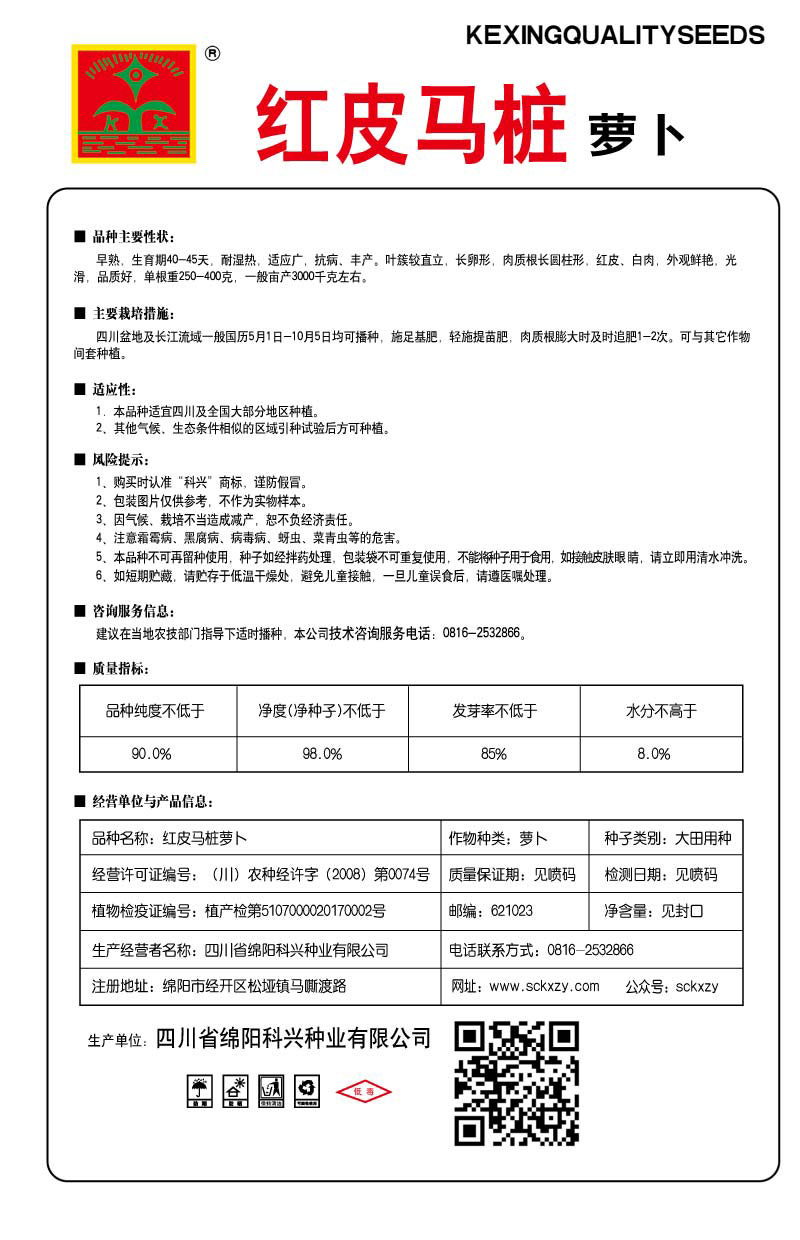 早熟,生育期40-50天,耐溫?zé)幔m應(yīng)廣,抗病,豐產(chǎn),葉簇較直立.長卵形,肉質(zhì)根長圓柱形,紅皮、白肉。外觀鮮艷,光滑,品質(zhì)好,單根重250-400克,一般畝產(chǎn)3000千克左右。