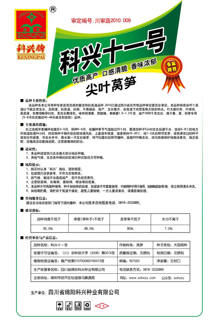 1、購買時認(rèn)準(zhǔn)“科興”商標(biāo),謹(jǐn)防假冒。2、包裝圖片僅供參考,不作為實物樣本。3.因氣候、栽培不當(dāng)造成減產(chǎn),想不負(fù)經(jīng)濟(jì)責(zé)任。4.注意軟腐病、灰需病、菌核病、蚜蟲等的危害。5、本品種不可再留種使用、種子如經(jīng)拌藥處理,包裝袋不可重復(fù)使用,不能將種子用于食用.如接觸皮膚眼睛,請立即用清水沖洗。6,如短期貯藏,請貯存于低溫干燥處,避免兒童接.一旦兒童誤食后.請遵醫(yī)處理。7、高溫季節(jié)栽培易抽苔,因此要加強(qiáng)肥水管理,否則會造成產(chǎn)量降低。萵筍不宜連作.連作病蟲害嚴(yán)重