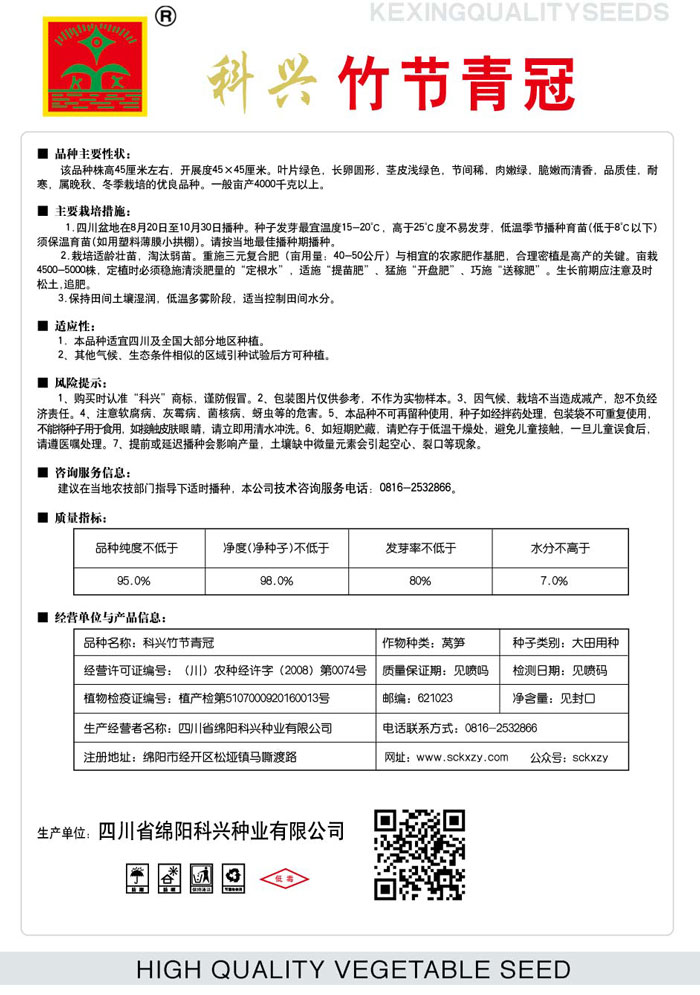 1、購買時認(rèn)準(zhǔn)“科興”商標(biāo),謹(jǐn)防假冒。2、包裝圖片僅供參考,不作為實(shí)物樣本。3.因氣候、栽培不當(dāng)造成減產(chǎn),想不負(fù)經(jīng)濟(jì)責(zé)任。4.注意軟腐病、灰需病、菌核病、蚜蟲等的危害。5、本品種不可再留種使用、種子如經(jīng)拌藥處理,包裝袋不可重復(fù)使用,不能將種子用于食用.如接觸皮膚眼睛,請立即用清水沖洗。6,如短期貯藏,請貯存于低溫干燥處,避免兒童接.一旦兒童誤食后.請遵醫(yī)處理。7、高溫季節(jié)栽培易抽苔,因此要加強(qiáng)肥水管理,否則會造成產(chǎn)量降低。萵筍不宜連作.連作病蟲害嚴(yán)重