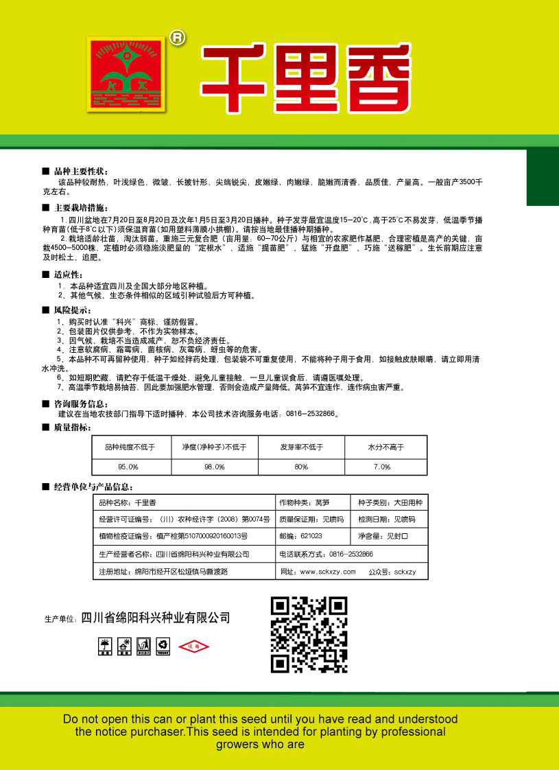 1、購買時(shí)認(rèn)準(zhǔn)“科興”商標(biāo),謹(jǐn)防假冒。2、包裝圖片僅供參考,不作為實(shí)物樣本。3.因氣候、栽培不當(dāng)造成減產(chǎn),想不負(fù)經(jīng)濟(jì)責(zé)任。4.注意軟腐病、灰需病、菌核病、蚜蟲等的危害。5、本品種不可再留種使用、種子如經(jīng)拌藥處理,包裝袋不可重復(fù)使用,不能將種子用于食用。如接觸皮膚眼睛,請立即用清水沖洗。6,如短期貯藏,請貯存于低溫干燥處,避免兒童接.一旦兒童誤食后.請遵醫(yī)處理。7、高溫季節(jié)栽培易抽苔,因此要加強(qiáng)肥水管理,否則會(huì)造成產(chǎn)量降低。萵筍不宜連作.連作病蟲害嚴(yán)重
