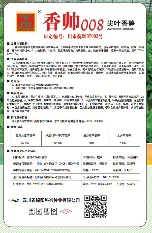 1、購買時認(rèn)準(zhǔn)“科興”商標(biāo),謹(jǐn)防假冒。2、包裝圖片僅供參考,不作為實物樣本。3.因氣候、栽培不當(dāng)造成減產(chǎn),想不負(fù)經(jīng)濟責(zé)任。4.注意軟腐病、灰需病、菌核病、蚜蟲等的危害。5、本品種不可再留種使用、種子如經(jīng)拌藥處理,包裝袋不可重復(fù)使用,不能將種子用于食用。如接觸皮膚眼睛,請立即用清水沖洗。6,如短期貯藏,請貯存于低溫干燥處,避免兒童接.一旦兒童誤食后.請遵醫(yī)處理。7、高溫季節(jié)栽培易抽苔,因此要加強肥水管理,否則會造成產(chǎn)量降低。萵筍不宜連作.連作病蟲害嚴(yán)重