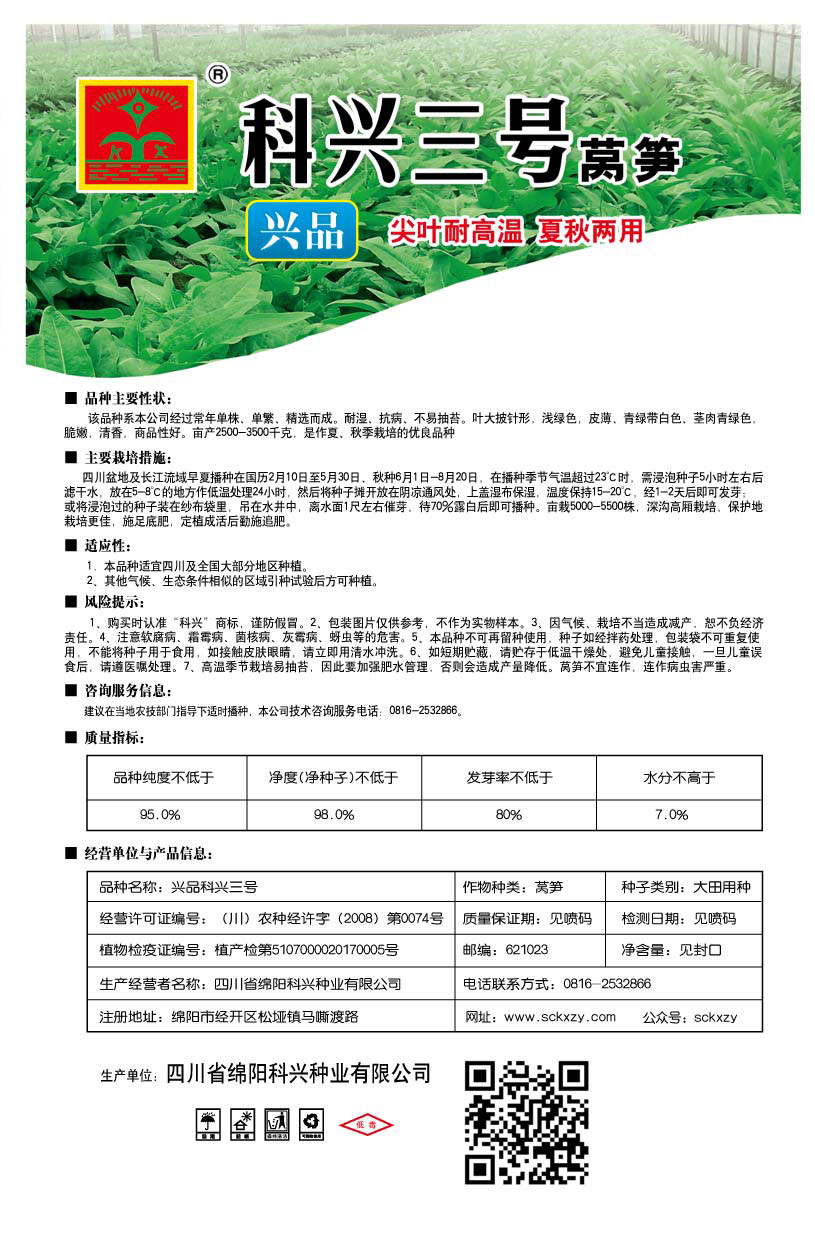 1、購買時認(rèn)準(zhǔn)“科興”商標(biāo),謹(jǐn)防假冒。2、包裝圖片僅供參考,不作為實物樣本。3.因氣候、栽培不當(dāng)造成減產(chǎn),想不負(fù)經(jīng)濟責(zé)任。4.注意軟腐病、灰需病、菌核病、蚜蟲等的危害。5、本品種不可再留種使用、種子如經(jīng)拌藥處理,包裝袋不可重復(fù)使用,不能將種子用于食用。如接觸皮膚眼睛,請立即用清水沖洗。6,如短期貯藏,請貯存于低溫干燥處,避免兒童接.一旦兒童誤食后.請遵醫(yī)處理。7、高溫季節(jié)栽培易抽苔,因此要加強肥水管理,否則會造成產(chǎn)量降低。萵筍不宜連作.連作病蟲害嚴(yán)重
