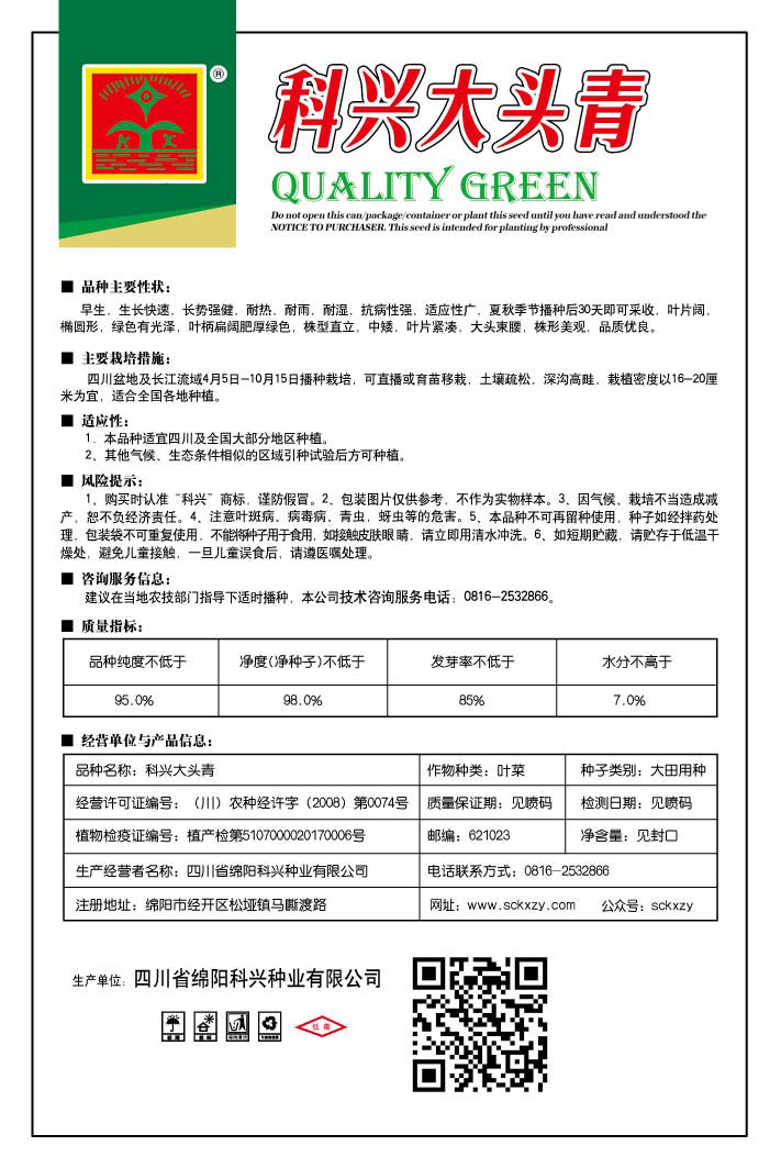 1、購買時認準“科興”商標,謹防假冒。2、包裝圖片僅供參考,不作為實物樣本。3.因氣候、栽培不當造成減產(chǎn),想不負經(jīng)濟責(zé)任。4.注意軟腐病、灰需病、菌核病、蚜蟲等的危害。5、本品種不可再留種使用、種子如經(jīng)拌藥處理,包裝袋不可重復(fù)使用,不能將種子用于食用。如接觸皮膚眼睛,請立即用清水沖洗。6,如短期貯藏,請貯存于低溫干燥處,避免兒童接.一旦兒童誤食后.請遵醫(yī)處理。7、高溫季節(jié)栽培易抽苔,因此要加強肥水管理,否則會造成產(chǎn)量降低。