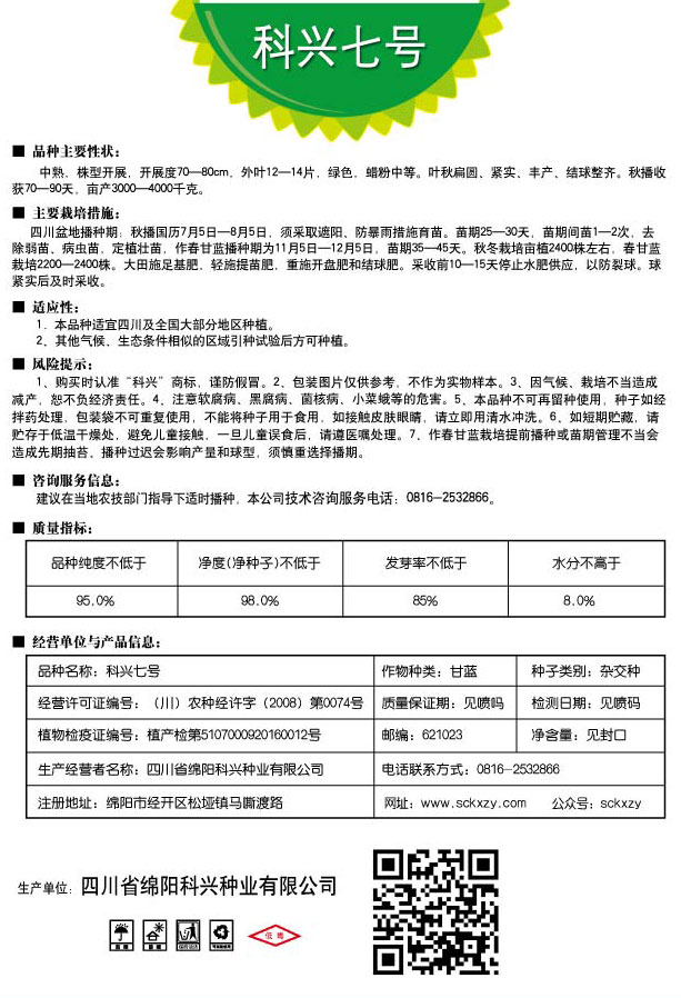1、購買時認準“科興”商標,謹防假冒。2、包裝圖片僅供參考,不作為實物樣本。3.因氣候、栽培不當造成減產,想不負經濟責任。4.注意軟腐病、灰需病、菌核病、蚜蟲等的危害。5、本品種不可再留種使用、種子如經拌藥處理,包裝袋不可重復使用,不能將種子用于食用。如接觸皮膚眼睛,請立即用清水沖洗。6,如短期貯藏,請貯存于低溫干燥處,避免兒童接.一旦兒童誤食后.請遵醫(yī)處理。7、高溫季節(jié)栽培易抽苔,因此要加強肥水管理,否則會造成產量降低。